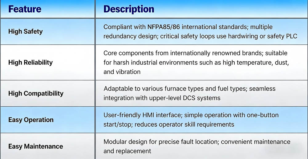 يلتزم نظام إدارة الاحتراق في فرن BMS بشكل صارم بمعايير سلامة الاحتراق الدولية مثل NFPA85 وNFPA86. إنها تعتمد بنية معيارية وقابلة للتكوين مناسبة لمختلف أنواع الوقود (الغاز الطبيعي، وزيت الوقود، وغاز الفحم، والكتلة الحيوية، وما إلى ذلك) وأنواع الأفران المختلفة (أفران التسخين، وأفران الصهر، والمحارق، وأفران الهواء الساخن، والغلايات، وما إلى ذلك). من خلال التحكم الدقيق في الإشعال، والتطهير، واكتشاف اللهب، والتحكم في الصمام، وحماية التعشيق، وغيرها من العمليات، يحقق النظام التشغيل الآمن التلقائي بالكامل لعملية الاحتراق.