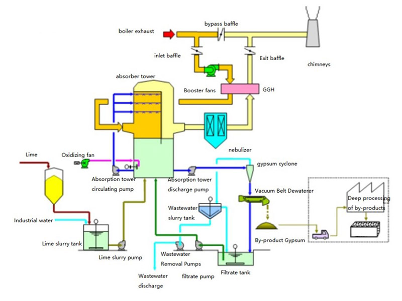 تعتمد شركة GeneralFlame على إزالة الكبريت الرطبة من الجبس: تستخدم هذه العملية الحجر الجيري أو ملاط الجير كمادة ماصة للتفاعل مع ثاني أكسيد الكبريت في غاز المداخن، مما ينتج عنه كبريتيت الكالسيوم. وبعد ذلك يتم تحويل كبريتيت الكالسيوم إلى كبريتات الكالسيوم (الجبس) من خلال عملية الأكسدة القسرية. يمكن معالجة الجبس وبيعه بشكل أكبر، بينما يتم تفريغ غاز المداخن المنقى في الغلاف الجوي. تتضمن خطوات التفاعل الرئيسية ما يلي: الامتصاص، والتحييد، والأكسدة.